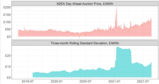 After the lockdown was introduced in March 2020, national electricity demand in GB fell nearly 20% – as did the wholesale prices. Summer 2020 was marked by fairly low day-ahead power prices of £25/MWh. Nonetheless, although prices remained relatively low, volatility of day-ahead prices accelerated from £5 to around £8/MWh amidst growing demand uncertainty, as depicted in the chart below.