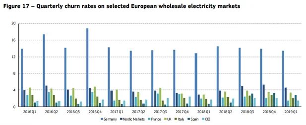 The chart above shows that on average and as of Q1 2019, Germany had a churn ratio of around 14, followed by the Nordic Markets and GB (churn fluctuating around 4), Spain (churn recently jumping to 3), Italy (churn around 2-3), concluding with France and the Central and Eastern Europe countries with churn ratio of 2 each. A noticeable difference between the leader and the rest gives food for thought. The German energy market is 3 to 7 times more liquid than other regional markets – unsurprisingly, it is also pretty saturated with algorithmic trading solutions.